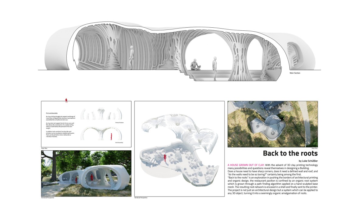Back to the Roots is an exploration in pushing the borders of architectural printing and organic design, the restaurant pavilion is confined by an organic root system which is grown through a path finding algorithm applied on a hand sculpted base mesh. The resulting root network is encased in a shell and finally sent to the printer. The project is not just an architectural design but a system which can be applied to any 3D object, turning it into a seemingly organic amalgamation of roots.