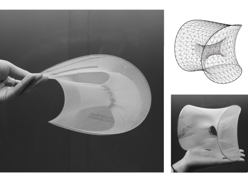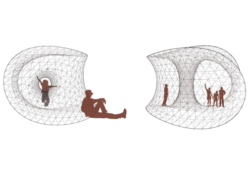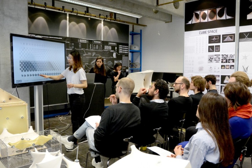 The idea of the project is based on the geometry of the invertible cube of the mathematician Paul Schatz. This geometry consists of two outer latch pieces and the middle belt part. The belt geometry consists of six sub-tetrahedrons, each with four surfaces and six edges. By arranging the tetrahedra at the connecting edges, the body can be rotated infinitely in one direction. The invertible cube is a rotoforming machine in its own right. Its infinite movement produces several rotoformed elements at the same time. The individual tetrahedron became the framework for our formwork systems. Three approaches can be pursued: The generation of volumes based on the entire tetrahedron, subtractive bodies, by using the edges of the tetrahedron as a frame to carry anchors of linear tension elements. In the project an initial weakness was turned into a major design feature: When prestressing a membrane in only one direction, drapery forms emerge. The team’s aim was to control and consciously design these shape in order to create the interesting contrast of a cast material having a textile appearance.