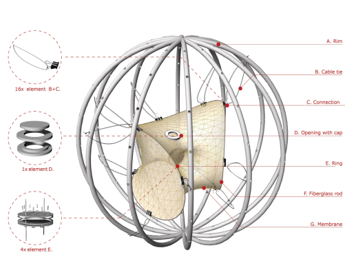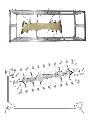 Dynamic formwing is a membrane formwork system for a rotoforming process that is inspired by the concept of tensegrity. Tensegrity is a structural principle in which isolated compression members are connected through a network of tension elements such as cables or membranes. The intricate balance between tension and compression generates flexible and lightweight systems. The term tensegrity was coined by Buckminster Fuller and integrates the two words “tension” and “integrity”. Dynamic formwing exploits the concept by combining hyperelastic membranes with compression members to form cavities for casting liquid material and rotoform elements. Compression members become permanent parts of the cast to form composite building elements.