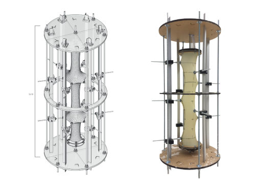 The Roto_Column team produced a broad range of columns based on latex sleeves prestressed through internal compression elements and external tension elements. An adaptable jig allowed the team to quickly produce differently shapes columns.