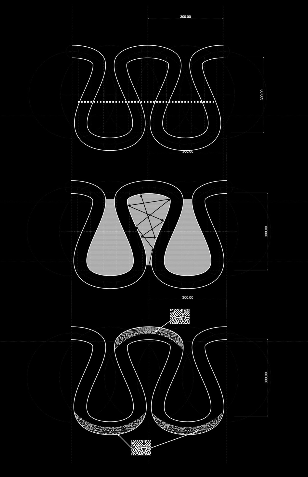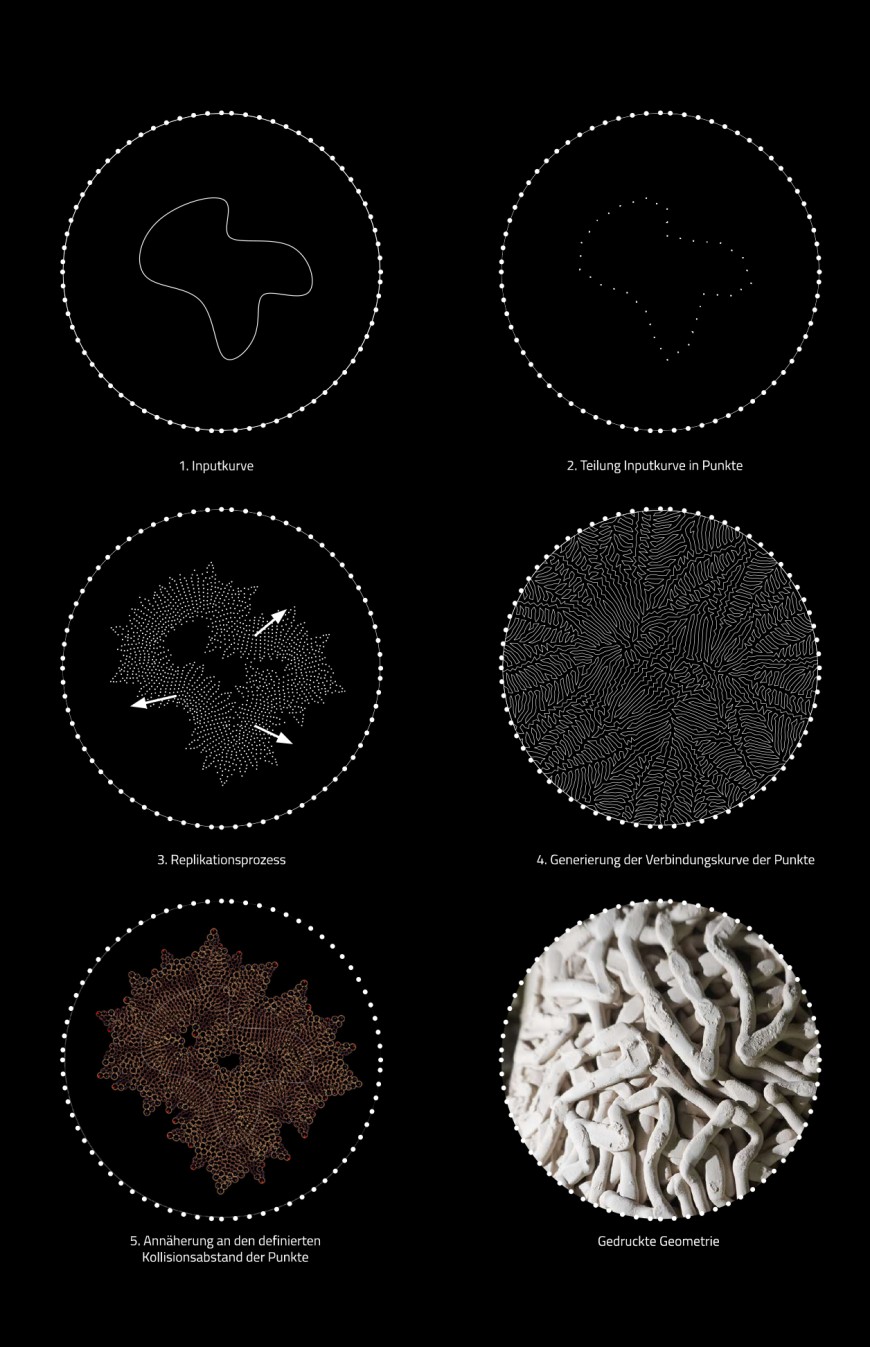 A key tool of the project is an algorithm that uses the principle of differential growth. The starting point is a curve that is divided into points and produces new branches in a replication process. This creates a channel-like structure that generates connected pores and thus avoids closed ones. When several of these curve systems are superimposed, a complex three-dimensional pore space develops. To optimize the superimposition and avoid predetermined breaking points, a syntax was developed that works with different curve inputs and placements. The geometry thus exhibits a high degree of tortuosity, which has been proven to have a positive effect on acoustic effectiveness and is also particularly suitable for additive manufacturing with clay.