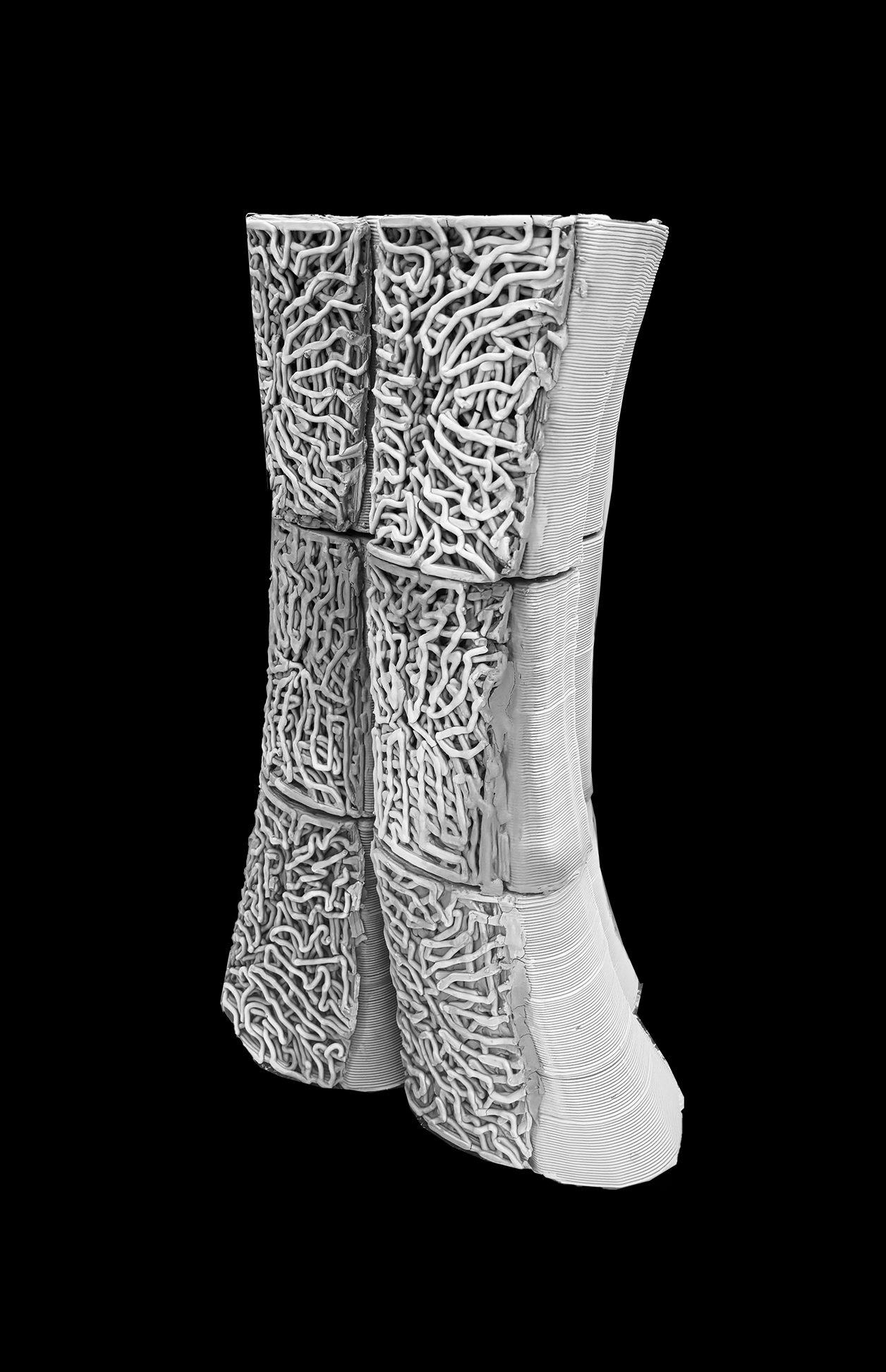 Since the growth pattern could only be printed stably in a horizontal position, it was not possible to produce the entire piece in a single printing process. The clay 3D printer used (WASP 40100) was not capable of reproducing the complexity of the designed geometry in terms of freedom of movement and nozzle guidance. For this reason, the main structure and growth pattern were produced separately and, after a three-day drying phase, joined together by slurrying and then fired. A special printing path was developed for printing the growth pattern, enabling non-planar printing with a vertically positioned nozzle.