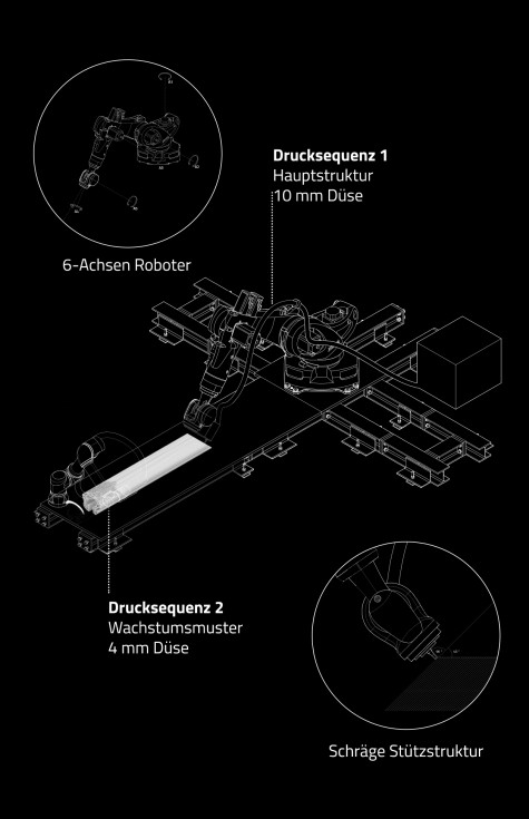 Unlike the 3D printer used for the prototype, the six-axis industrial robot enables non-planar paths to be printed using a sideways-mounted print nozzle. Production takes place in two consecutive printing sequences: First, the main structure is produced using a large-caliber nozzle (diameter approx. 10 mm). Since the growth pattern only achieves good sound absorption coefficients at low resolution, it is applied directly to the previously printed main structure in a second step using a finer nozzle with a diameter of 4 mm. The main structure itself is also manufactured on a 45-degree inclined plane in order to create a material-efficient geometry that does not require additional support structures. This method has already been presented by Wüthrich et al. (2021) and applied in practice by The New Raw (2025), for example. The modular components are ideal for prefabrication, which enables both higher production quality and time- and cost-efficient implementation.