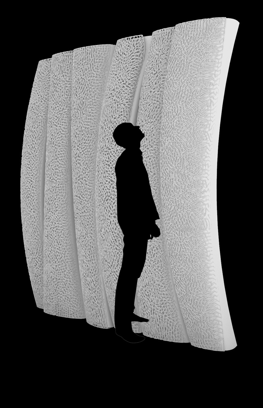 This work has resulted in a prototype that combines acoustic and aesthetic functions. The combination of the main structure and porous growth pattern shows that purely ceramic material can be used to develop an effective, recyclable alternative to conventional acoustic foams. Silent Silhouettes demonstrates how additive manufacturing, materials research, and acoustic design can be brought together to make construction practices more sustainable.