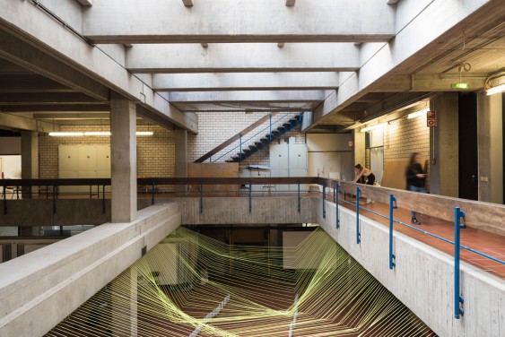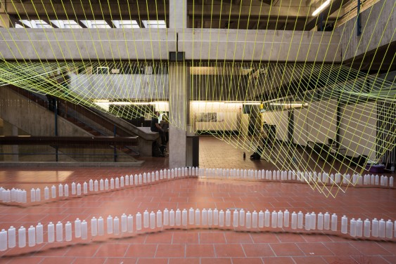August 2017, End of Year Exhibition Gestalten mit Medien, Darmstadt. 108 first year students teamed up to design and build an installation made from 108 yellow threads and water filled plastic bottles acing as weights. The piece synthesizes a series of exercises on digital design tools and parametric graphic statics taught in collaboration with Institute of Structural Mechanics and Design (ISMD)